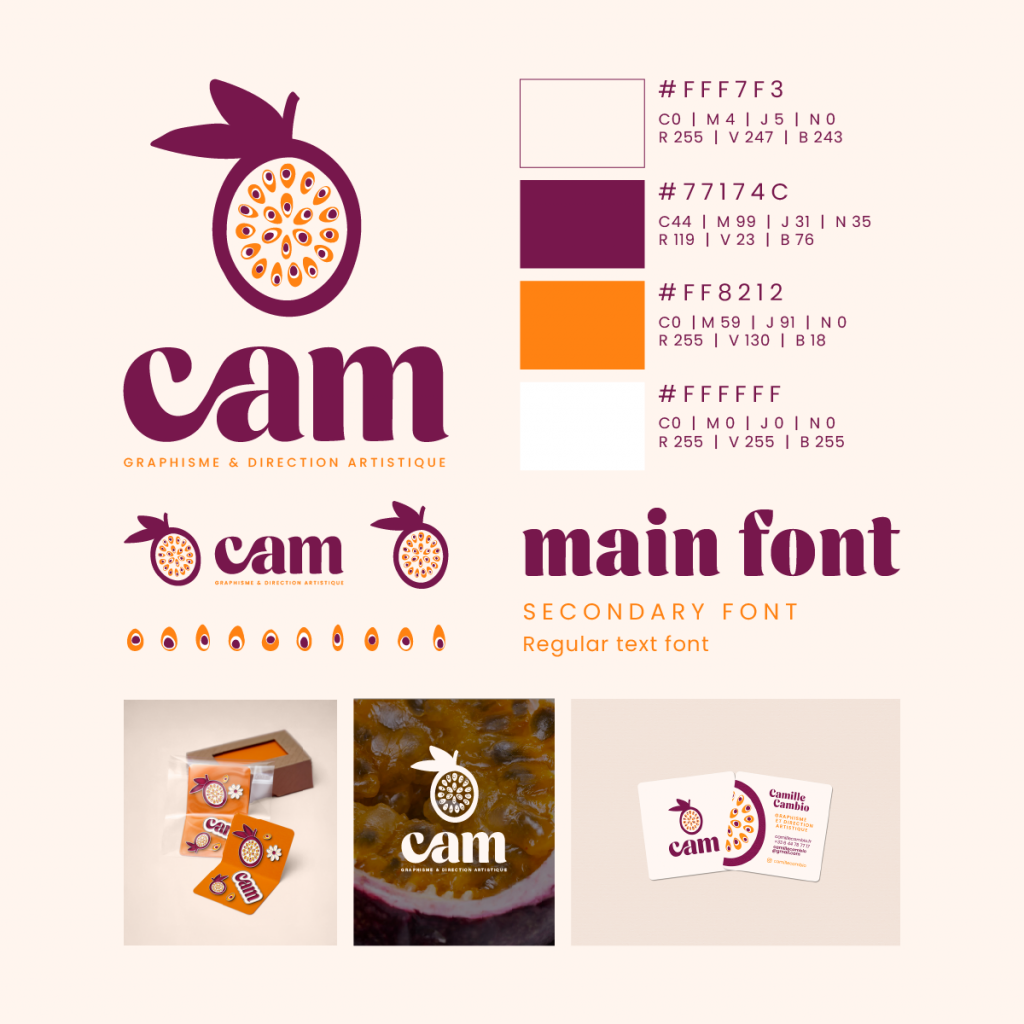 - un brandbord professionnel contenant logo, typographies, palette de couleurs, images d’inspiration et exemples d’utilisation du logo