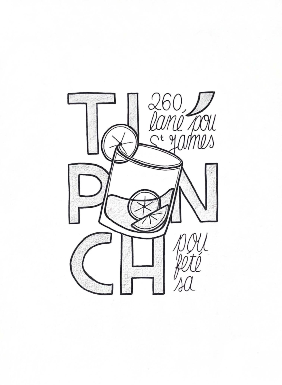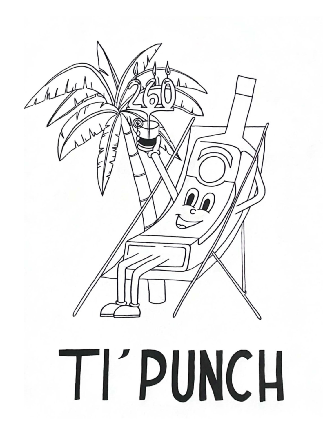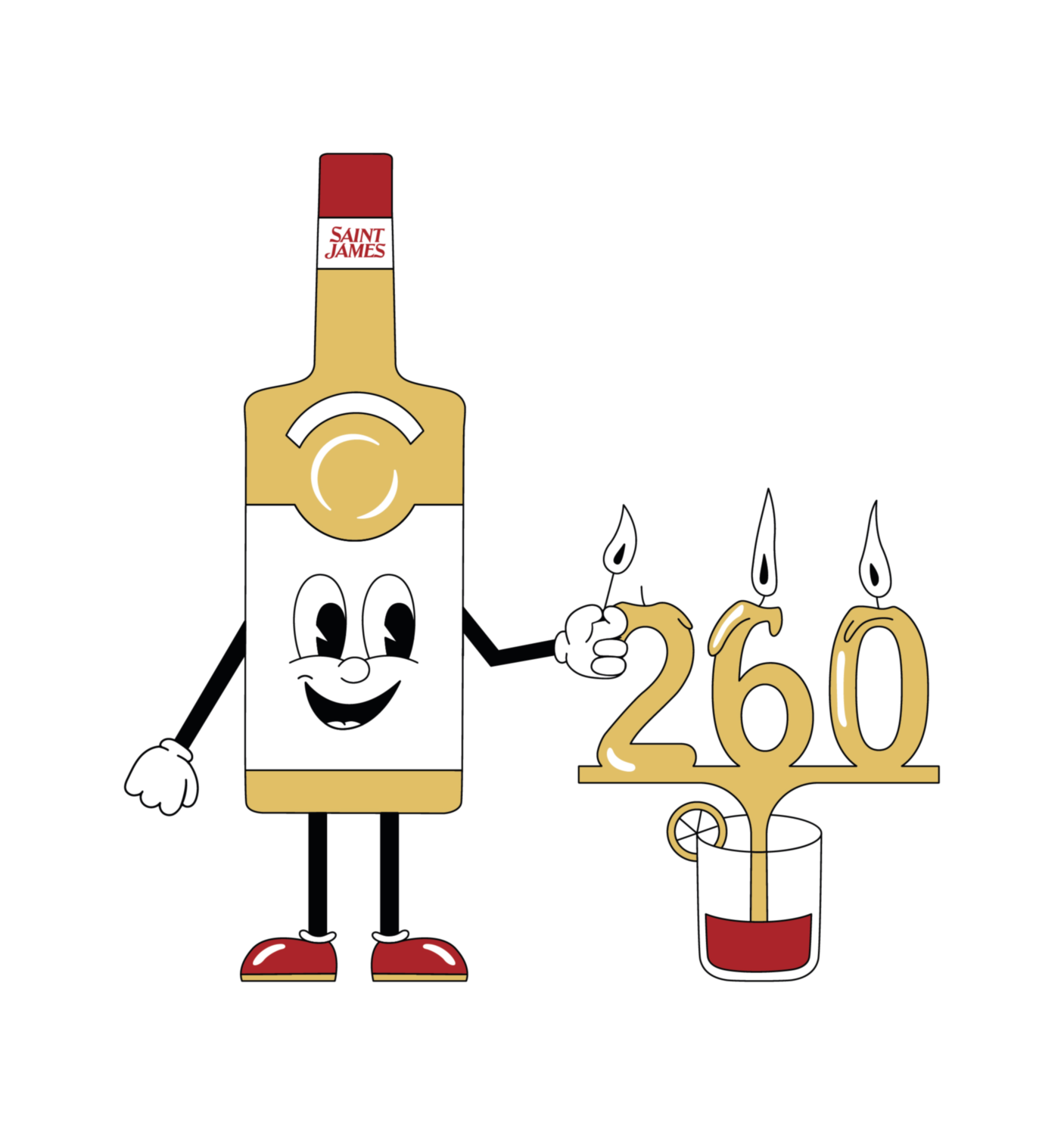 Illustration conçue pour la sérigraphie du t-shirt porté par les bartenders de la marque Saint-James. Le visuel reprend les couleurs de la marque, la bouteille en version cartoon créée lors de notre collaboration précédente et fait référence aux 260 ans de la marque martiniquaise de rhum.