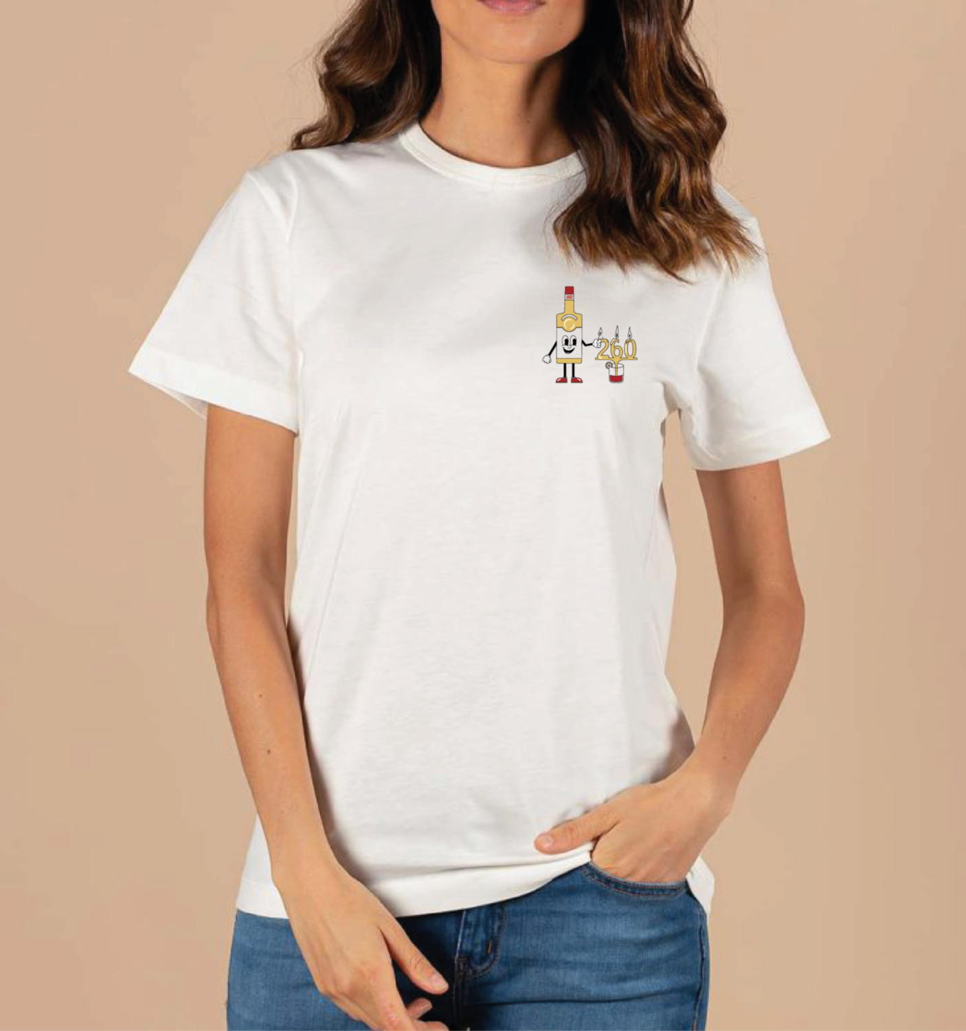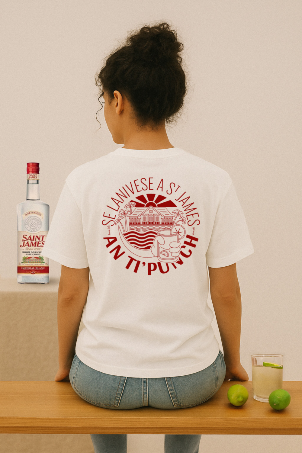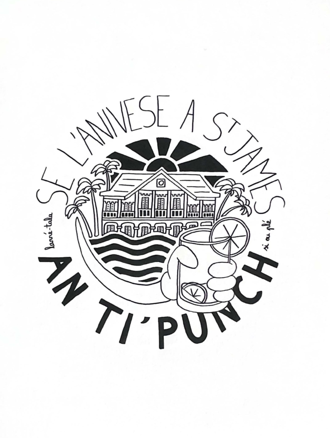 Illustration conçue pour la sérigraphie du t-shirt porté par les bartenders de la marque Saint-James. Le visuel reprend les couleurs de la marque, la bouteille en version cartoon créée lors de notre collaboration précédente et fait référence aux 260 ans de la marque martiniquaise de rhum.