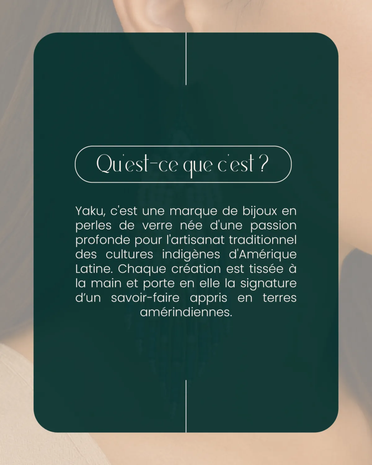 Yaku est une marque de bijoux en perles de verre née d’une passion profonde pour l’artisanat traditionnel des cultures indigènes d’Amérique Latine. Chaque création est tissée à la main et porte la signature d’un savoir-faire appris en terres amérindiennes.